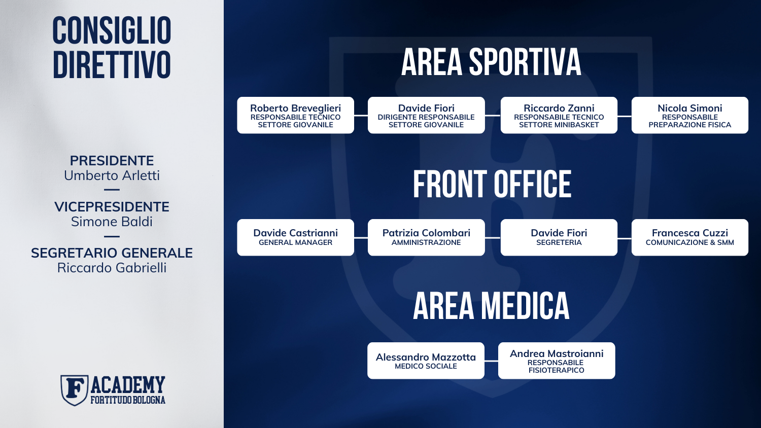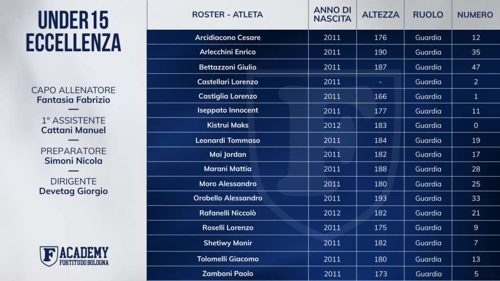 In qualità di società sportiva dilettantistica satellite di Fortitudo Pallacanestro 103 Fortitudo Academy coordina l’attività di oltre 150 giovani atleti ed atlete selezionate e partecipa alle competizioni di eccellenza per i campionati dall’under 13 all’under 19 maschile ed il campionato serie C femminile.