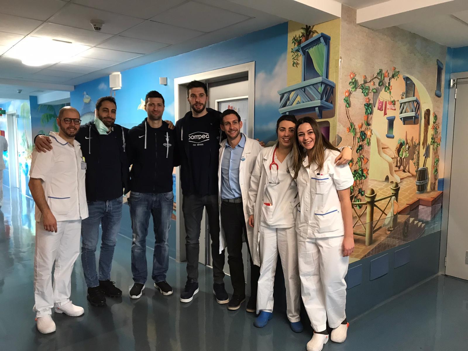 In questi giorni, i giocatori della Fortitudo Pompea Matteo Fantinelli, Rok Stipcevic, Daniele Cinciarini e il Presidente dell’Associazione ‘Fortitudo per il Sociale’, Giorgio Archetti, hanno accompagnato una delegazione di ragazzi della Fossa dei Leoni per la consegna delle Strenne Natalizie ai bambini del reparto oncologico Gozzadini di Bologna.