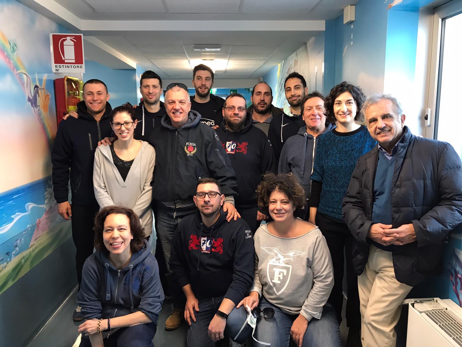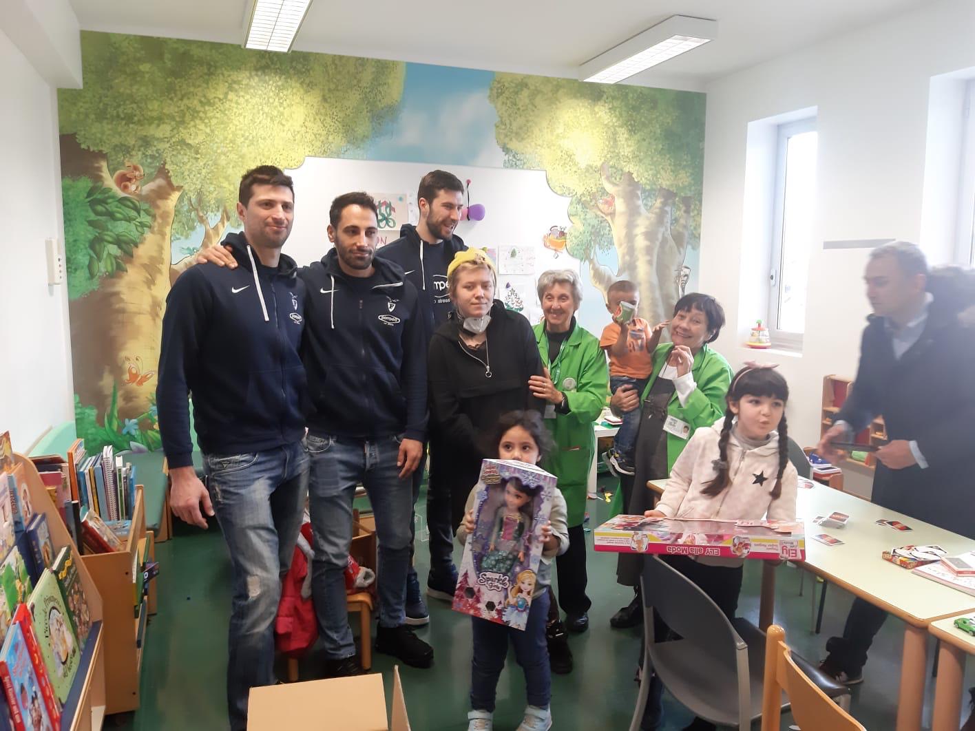 Un momento emozionante e particolarmente sentito da squadra e staff che, come ormai da tradizione, grazie all’aiuto dei ragazzi della Fossa, hanno potuto consegnare ai bambini del reparto i giocattoli donati e raccolti durante le ultime partite disputate al PalaDozza dalla prima squadra.